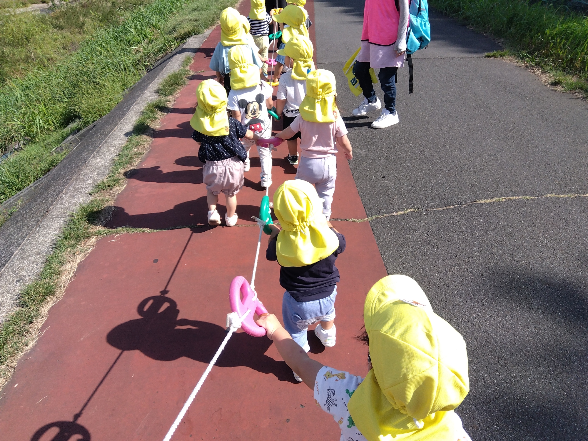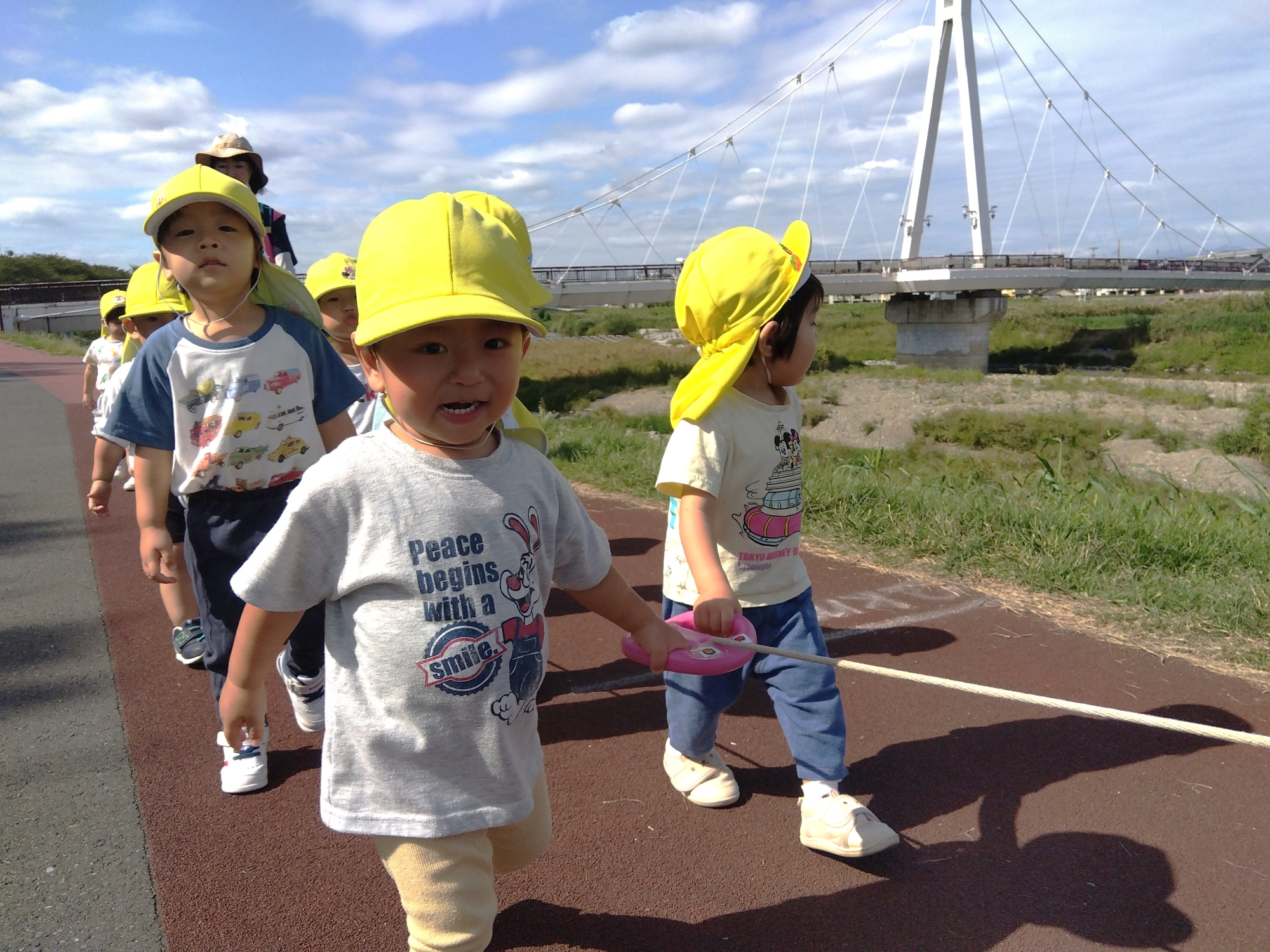 子どもたちは散歩ロープを握って浅川土手や向島緑地にお散歩に行っています。