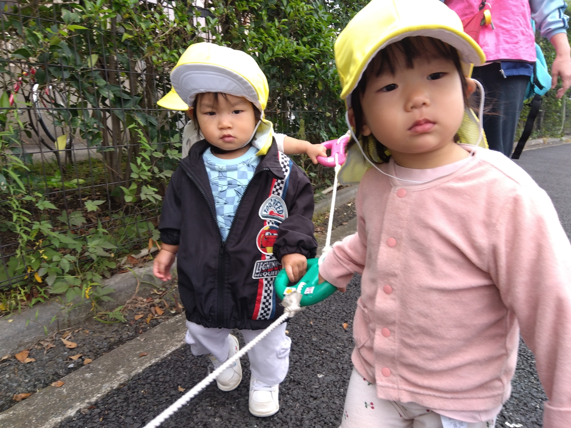 天気が良い日は、お散歩に行き沢山身体を動かして遊んだり、植物など自然に触れながら遊んでいます。子どもたちも歩行が少しずつ安定してきていて、お散歩の行き帰りは散歩ロープを握って「いち、に、いち、に」と掛け声を掛け合って歩いたり、歌をうたいながら楽しく歩いています。