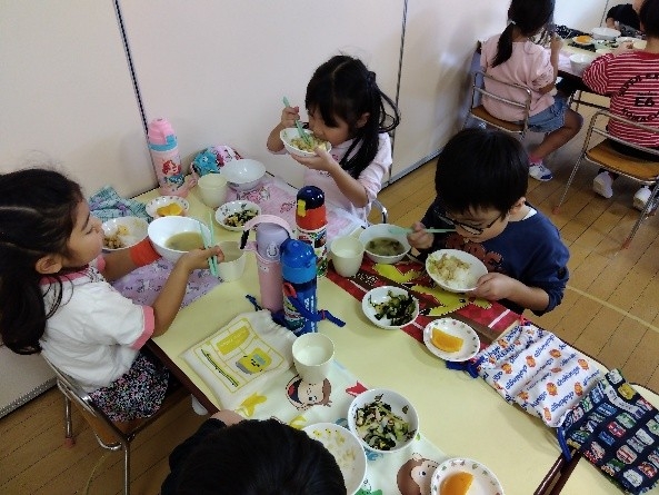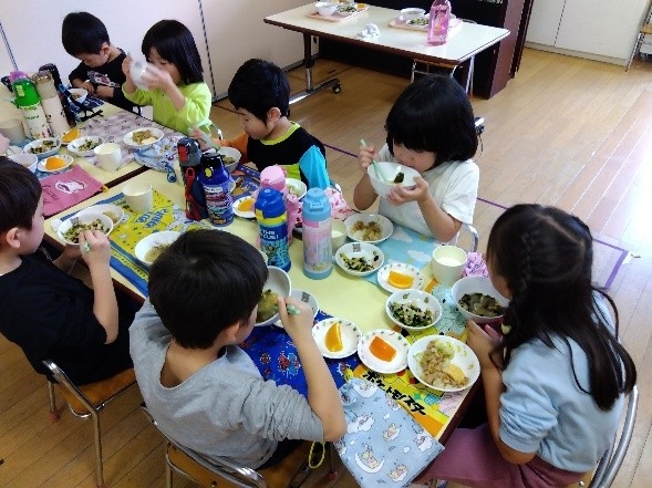 昨年から給食ではスプーンやフォークを併用しながらお箸を少しずつ練習してきました。うめ組になってすぐの頃は、途中でスプーンを取りにきて併用しながら食べる子が数人いましたが、今ではほとんどの子が最後までお箸を上手に使って食べることができるようになりました。お箸を持つ手とは反対の手でお皿を持つように伝えたり、膝をつけ正しい姿勢で食べることを伝えたりしながら楽しく食事をしています。また、自分で給食を取りに来たり、食べる前に量を調節したりもしています。