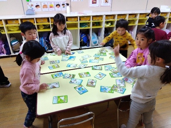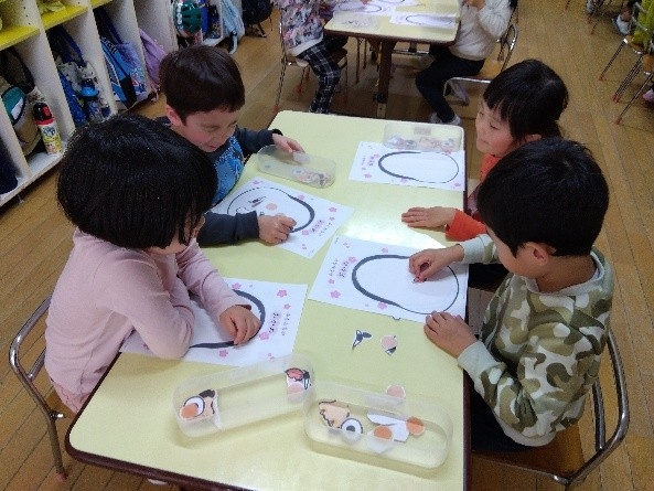 友だちと白熱してかるたを楽しんでいました。福笑いでは、自分で顔のパーツを切ってからスタート!目をつぶって顔のパーツを置いたり、友だちと一緒に教え合ったりしながら楽しむ姿が見られました。