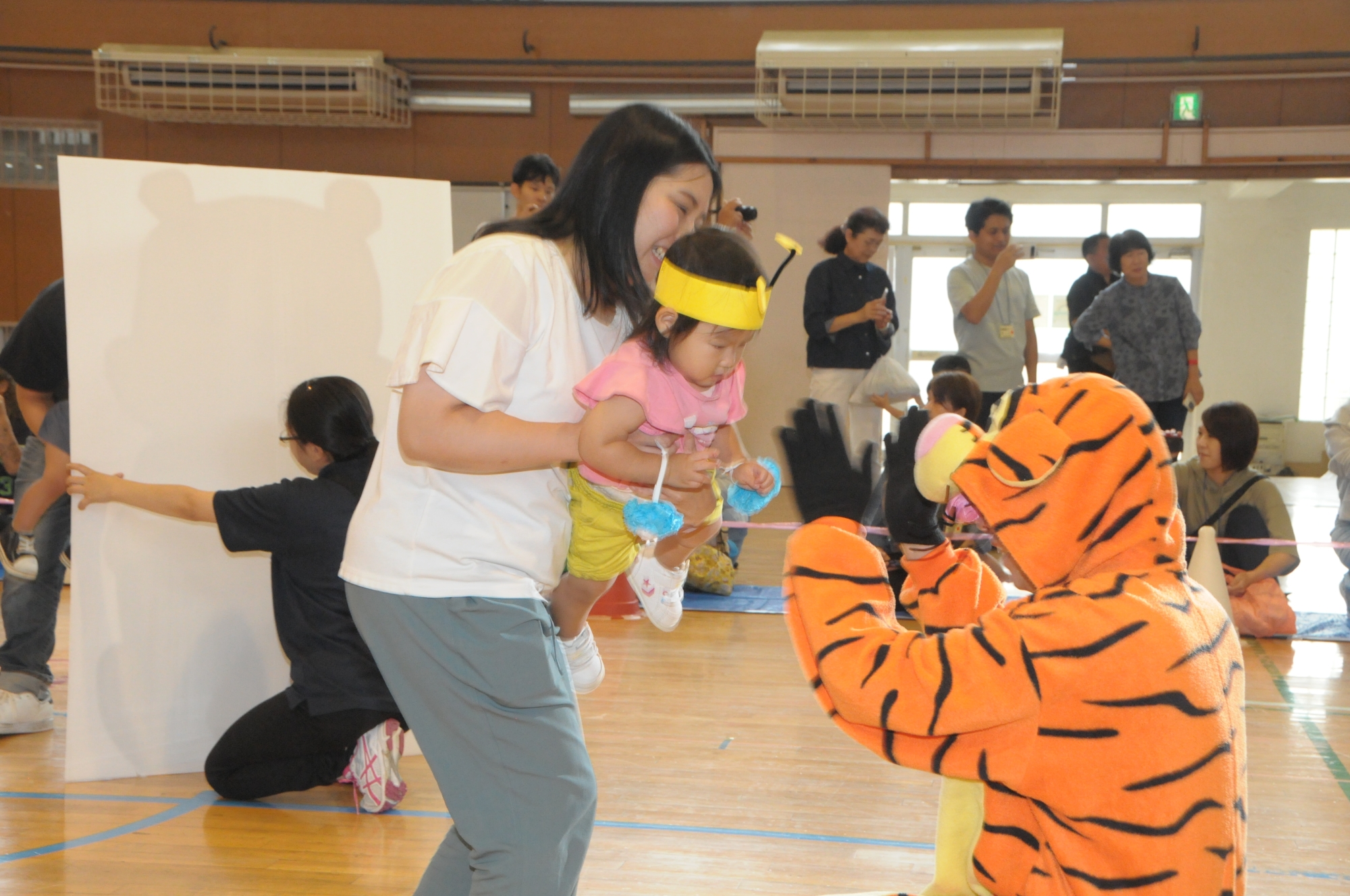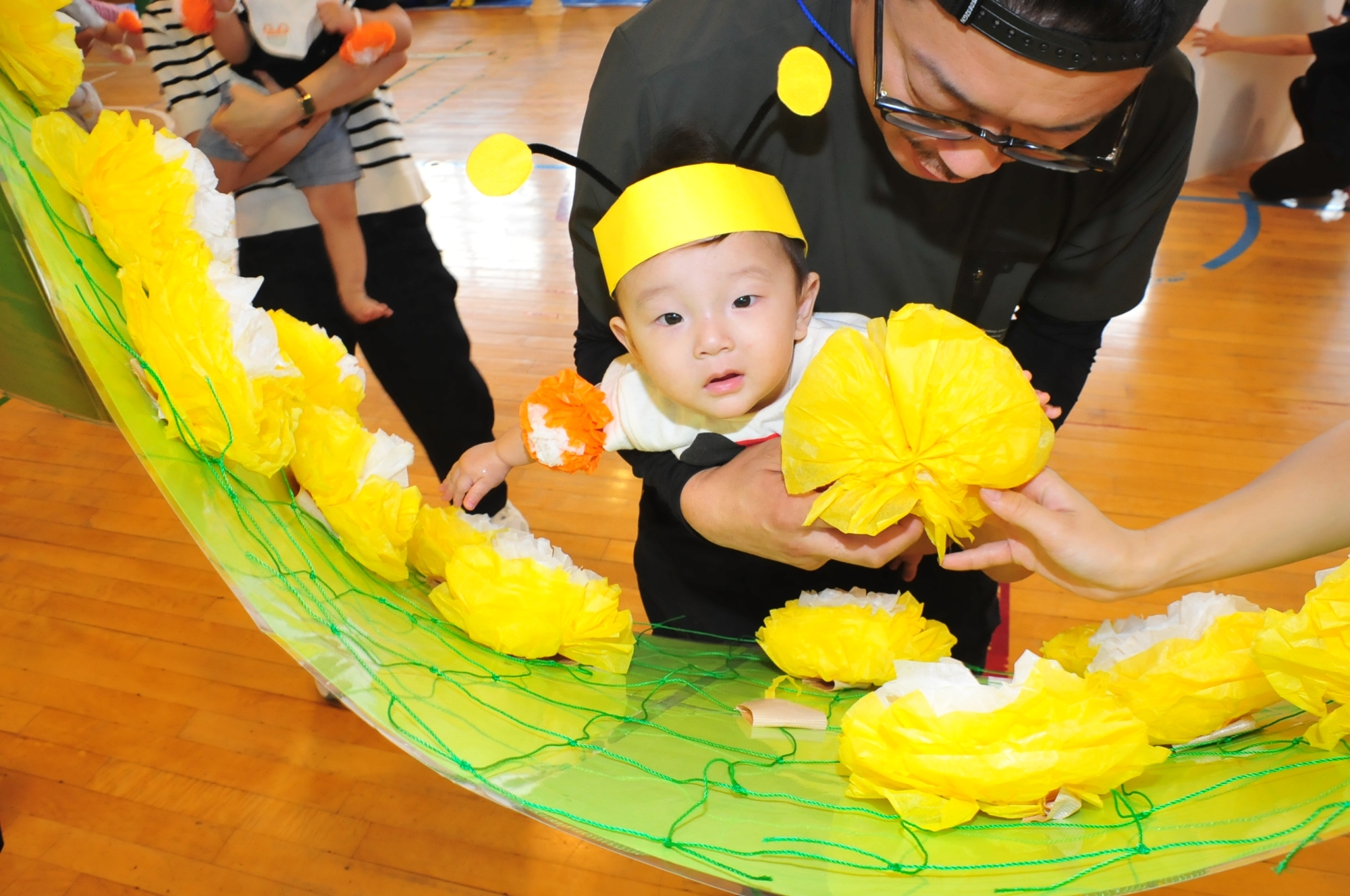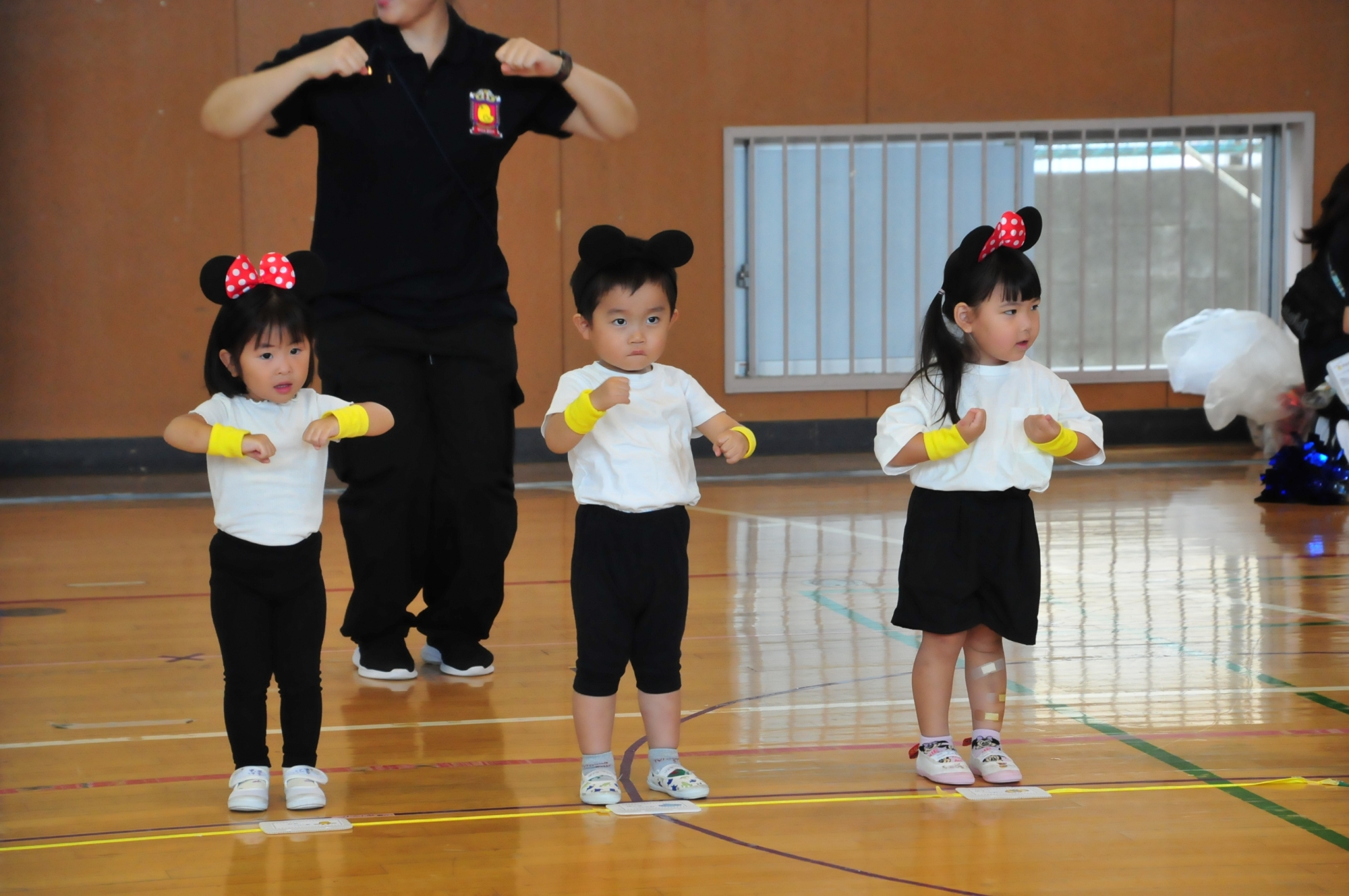 乳児クラス(0・1才児)親子競技(プーさんのはちみつあつめ)はお家の人に抱っこされながらはちみつを集めて楽しみました。2才児はみんなでミッキー・ミニーの耳をつけ子どもたちの大好きな曲ミッキーマウスマーチで踊りました。幼児クラス(3・4・5才児)は週1日(月曜日)に専門の先生が来園して体育指導を教えてもらっていますがその成果を体育発表又組立体操として披露し各クラス楽しんでおゆうぎを発表できました。行事を通してまた1つ成長した子どもたちでした。