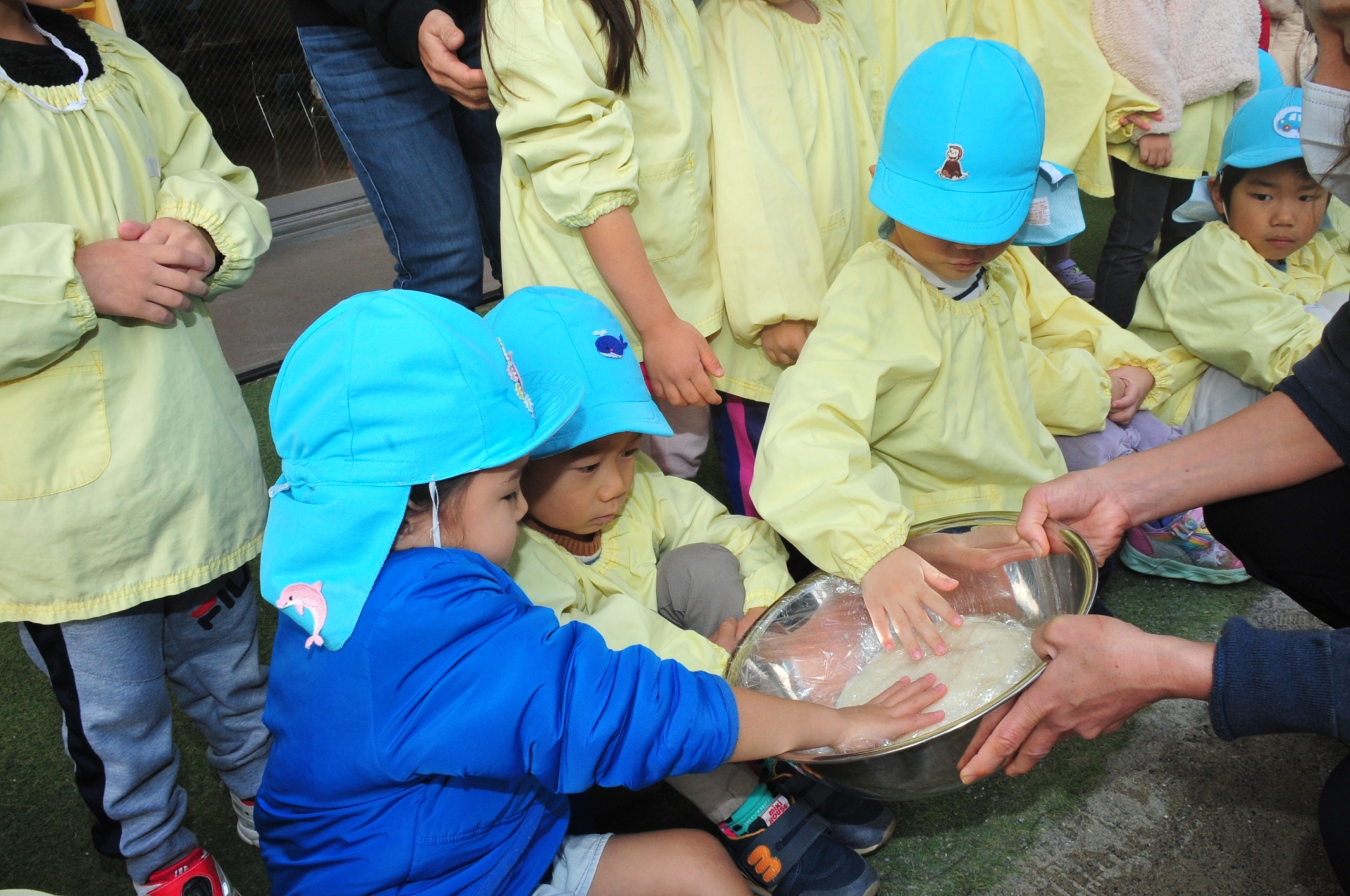 おもちつきが始まると、職員が杵でおもちをつく動作に合わせて、「よいしょー!よいしょー!」と応援し、伸びるおもちを見て「すごーい!」「おもちになってる~!」と大興奮の子どもたちでした。