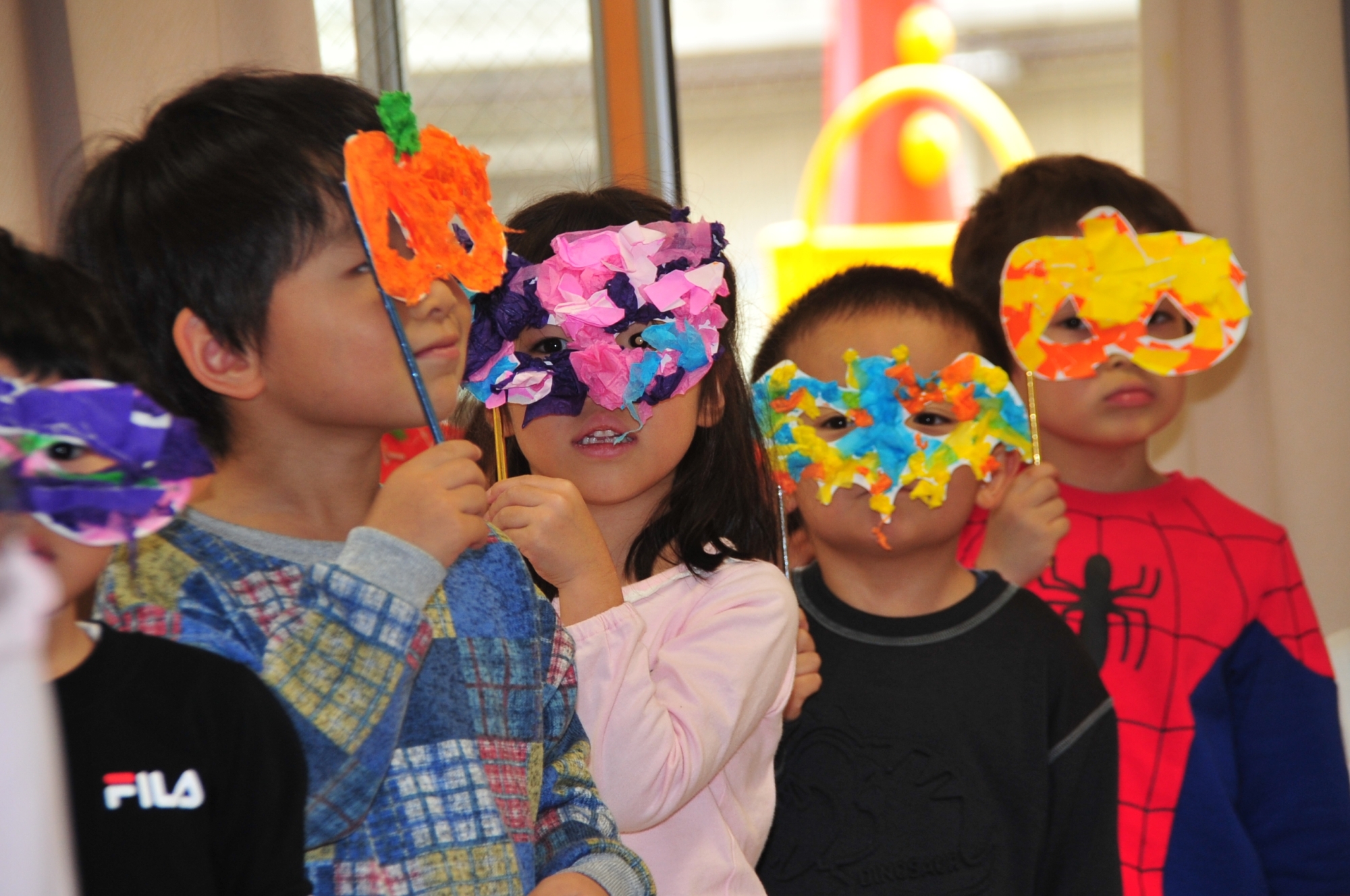 各クラスで製作したかばんや仮面などの小道具を手に持って、「トリックオアトリート!」と元気よく合言葉を口にしていた子どもたち。乳児クラスも不思議そうな表情を見せながらも、しっかりとお菓子を受け取ることが出来ました。いつもと異なる雰囲気の中で、ワクワクとした様子を見ることが出来ました。