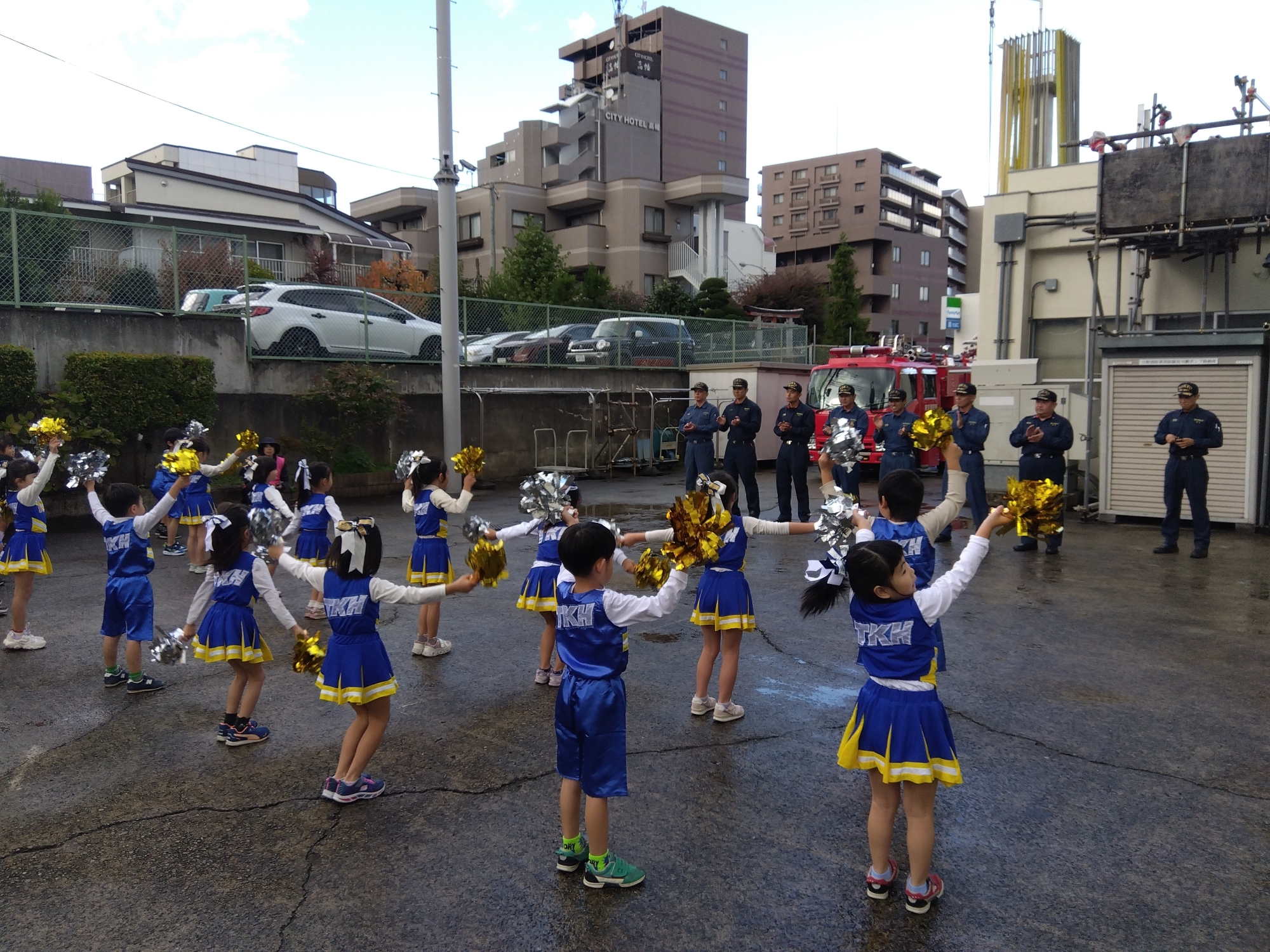「勤労感謝の日」にちなみ、さくら組の子どもたちが「勤労感謝の訪問」に行きました。11月10日は日野消防署高幡出張所に、11月14日は高幡不動駅の京王電鉄と交番を訪問しました。両日とも少し緊張した様子でしたが、感謝の言葉を伝え、笑顔でチアダンスを披露しました。消防士の皆さん、駅員さんや警察官さんから「みんなのダンスを見たり、感謝の言葉を聞いてお仕事を頑張ろうと思いました」とお礼の言葉をいただきました。