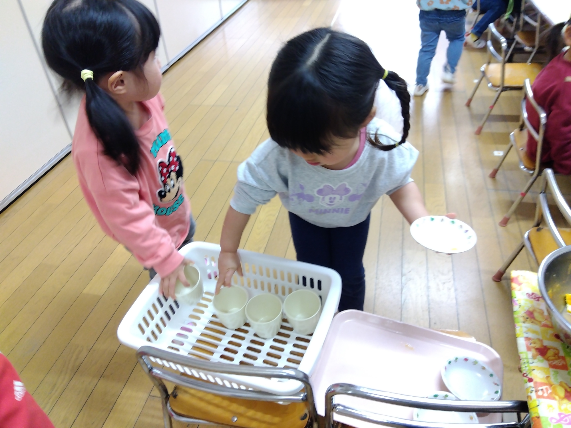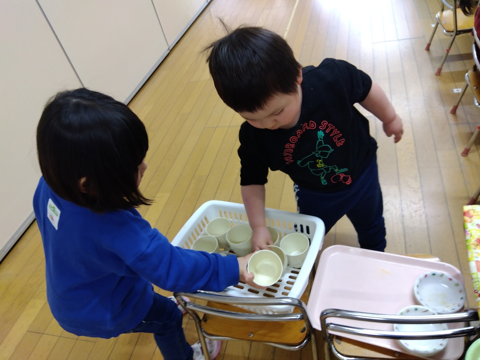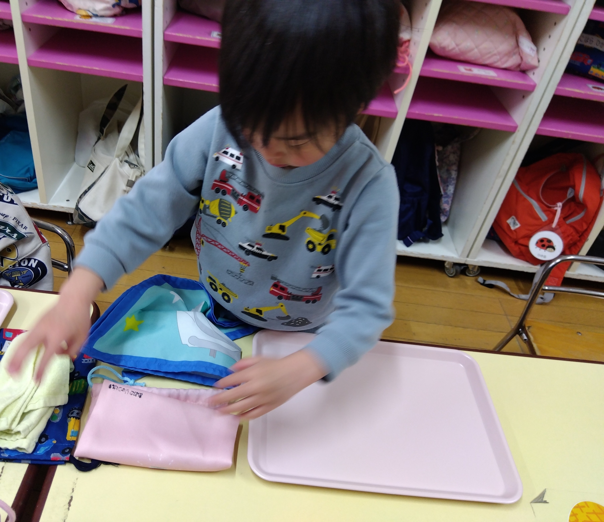 進級に向けてもも組では、身の回りのことを自分でやってみようという気持ちが育ち、給食のコップやフルーツのお皿を片付ける、脱いだ服を畳む、口拭きタオルの準備や片付けなど保育者に見守られながら一生懸命取り組んでいます。