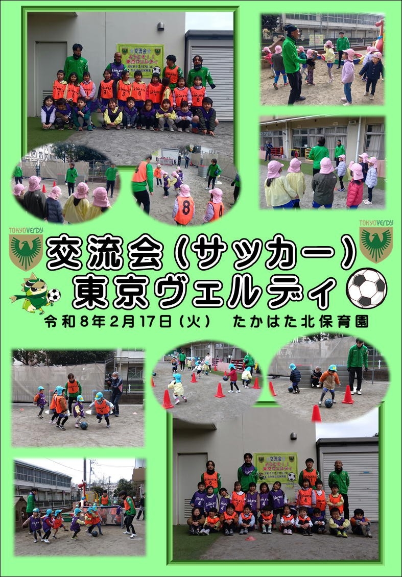 先日、J1サッカーチーム「東京ヴェルディ」との交流会が行われました。昨年も来てくれたコーチもいた為、すぐに仲良くなり、楽しく元気にウォーミングアップからスタート。続いてコーンや相手をよけながらのドリブルや力強くシュートを打つ練習では、みんな真剣な良い表情をしていました。最後はコーチと子ども3人ずつのチームでゲーム開始!どのチームからも、たくさんのゴールと笑顔が生まれ、白熱した試合でした。